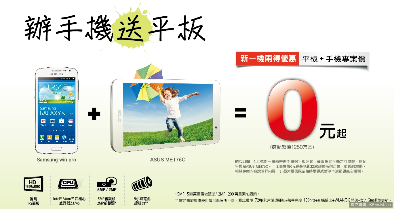 Samsung Win Pro + ASUS ME176C 專案價0元係指搭配1250超值系列方案,並綁約30期。