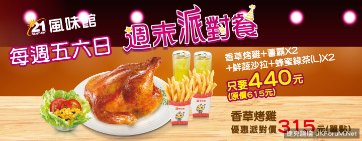 •週末派對餐(香草烤雞+薯霸x2+鮮蔬沙拉+蜂蜜綠茶(L)x2)只要440元(原價615元)