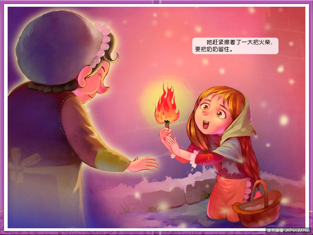 這時候小女孩想起以前沒賣出去的火柴,於是點起一把火柴,想要看看野獸的那些回憶,卻出現了一直很疼愛她的奶奶,火柴熄滅了,女孩又點起一把火柴想要把奶奶留住∼ |