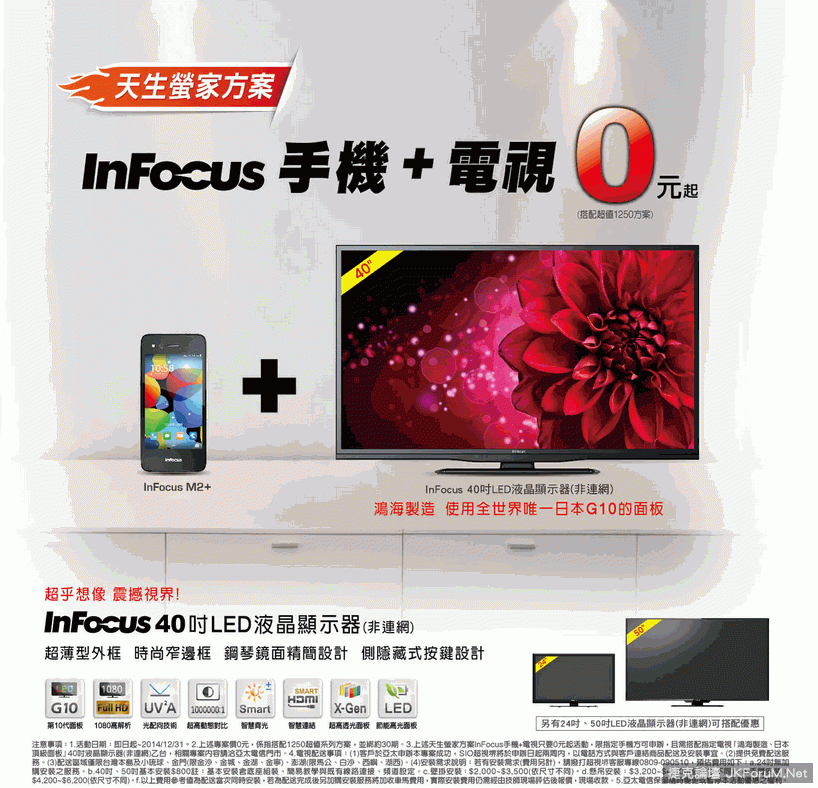 • 上述天生螢家方案InFocus手機+電視只要0元起活動,限指定手機方可申辦,且需搭配指定電視「鴻海製造、日本頂級面板」40吋液晶顯示器(非連網)乙台,相關專案請洽亞太電信門市