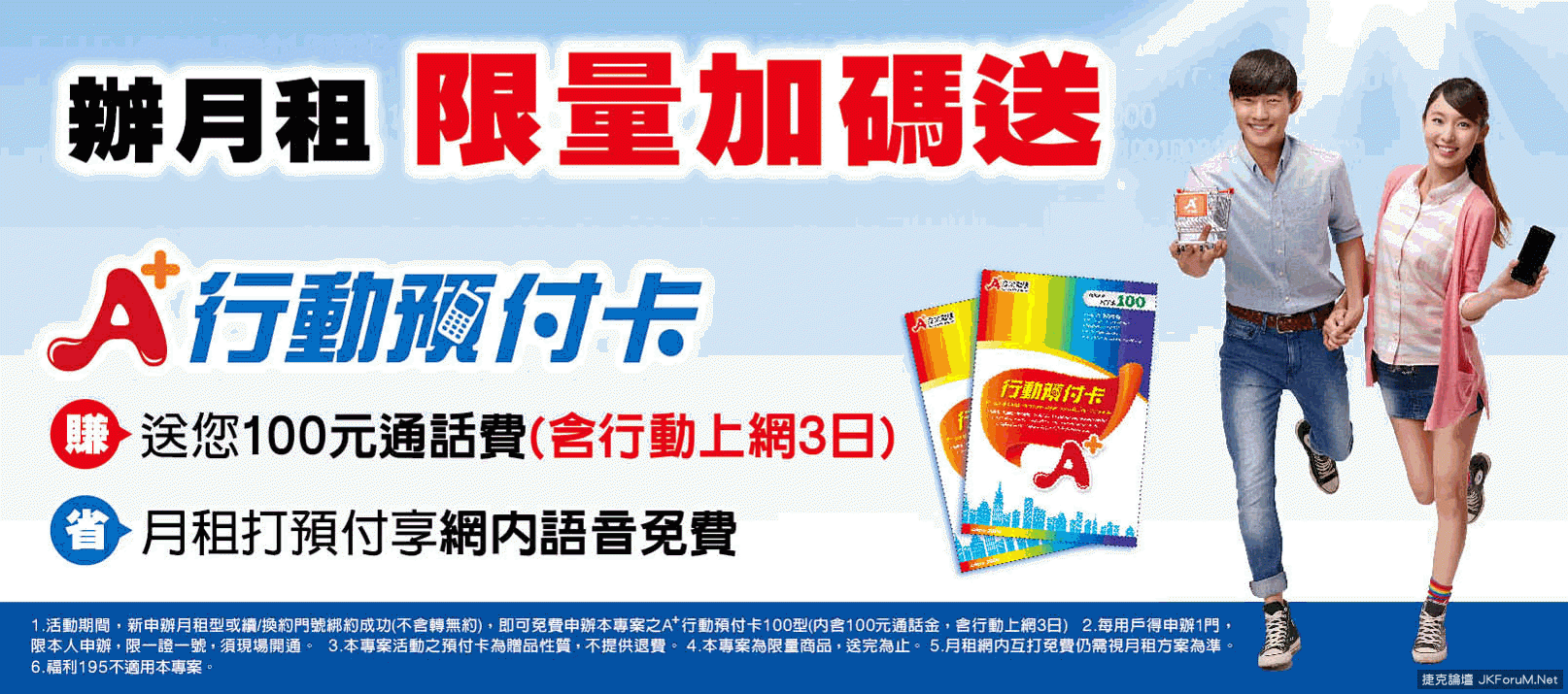 1.活動期間,新申辦月租型或續/換約門號綁約成功(不含轉無約),即可免費申辦本專案之A+行動預付卡100型(內含100元通話金、含行動上網3日)