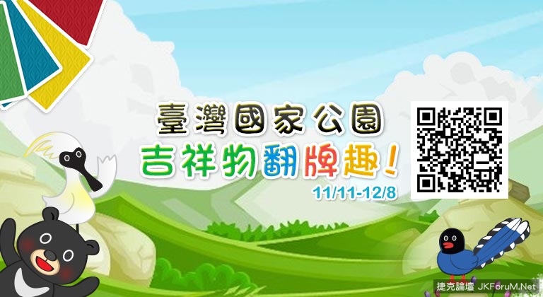 本次「臺灣國家公園-吉祥物翻牌趣」活動自103年11月11日起至103年12月08日止,參與「臺灣國家公園-吉祥物翻牌趣」活動的民眾,不僅可以透過吉祥物瞭解臺灣的美麗生態,認識更多台灣稀有的生物,越多人參加,得到大獎的機會就越高喔!