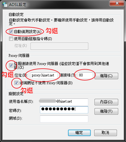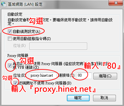 在位址的地方輸入「proxy.hinet.net」,連接埠選擇「80」