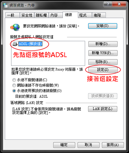 一樣是在分頁「連線」,先選擇ADSL的撥號,點選右邊的「設定」