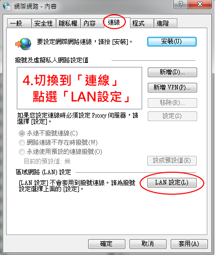 請先切換到分頁「連線」,點選下面的「LAN 設定」