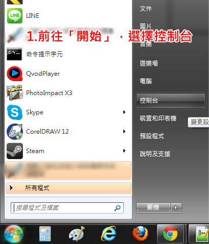 第一步點選「開始」,選擇「控制台」(Win8要找一下控制台)