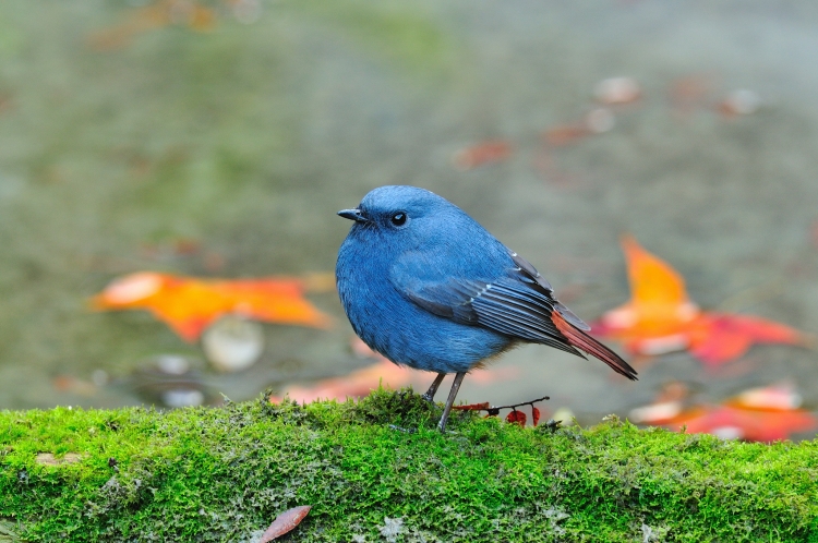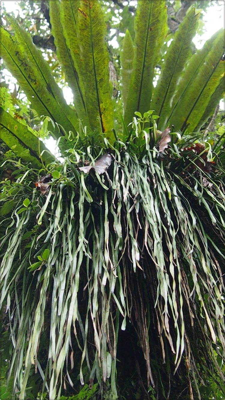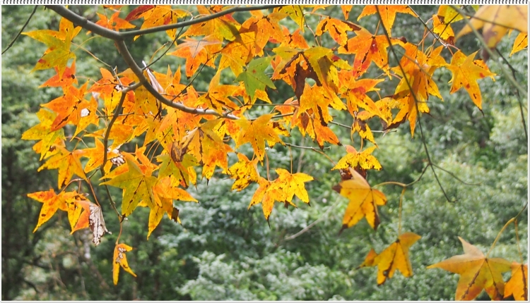 行進間, 眼前一片翠綠, 地上, 樹上都長滿綠得快出水的蕨類植物, 更有金黃的楓葉, 不知名的火紅樹葉妝扮著這片空間, 揮灑著五彩顏料, 讓人驚艷.
