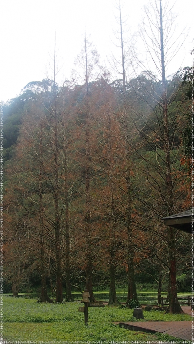當步入參觀路線, 首先在右手邊的是一排不高的綠圍, 那可是保育類的植物, 台灣特有種—台灣油杉, 再前進幾步路, 映入眼簾的是一方大大的池水和數顆高高的落羽松, 冬季落羽松黃中帶紅的羽葉, 有著它特有的風姿.