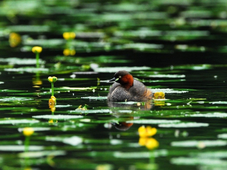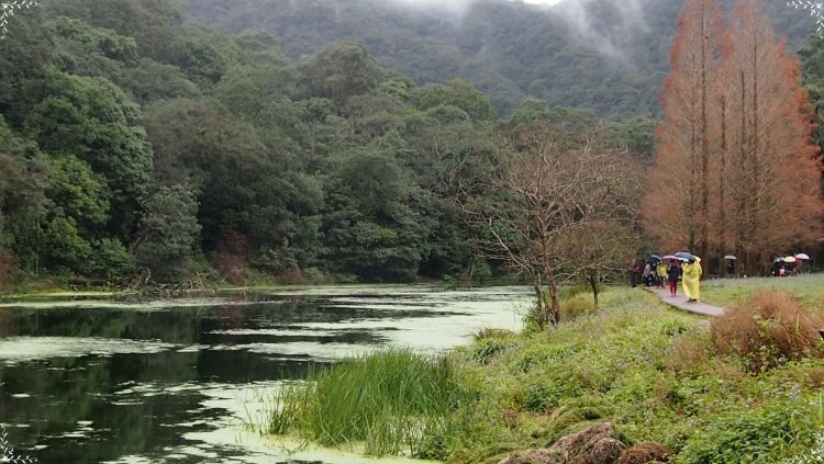 那方水域中有著台灣特有種的台灣萍蓬草, 它的花是黃花, 中心是暗紅色, 目前不是開花期, 水域數種留鳥不時穿梭其間, 有鴛鴦, 紅冠水鷄, 白鷺, 小鷿鷈…..