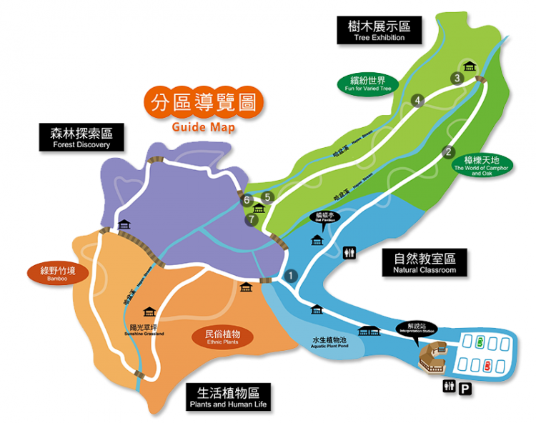 樟樹和殼斗科櫟屬是台灣早期先民生活上不可或缺的樹種, 在展示區中種植了各種樟科和殼斗科的樹種, 在林間你可以看到一條彎延的小溪, 那可是有名的哈盆溪, 最終入青潭為大台北水源之一.