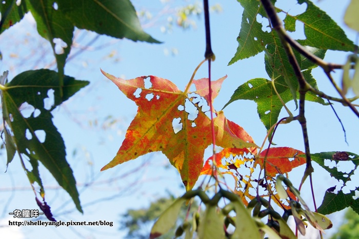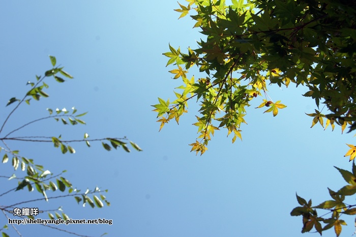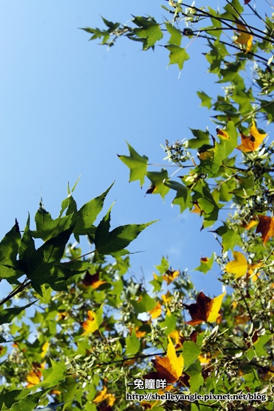 藍天底下,楓紅伴隨的綠葉,讓人感覺到秋天的腳步也近呢