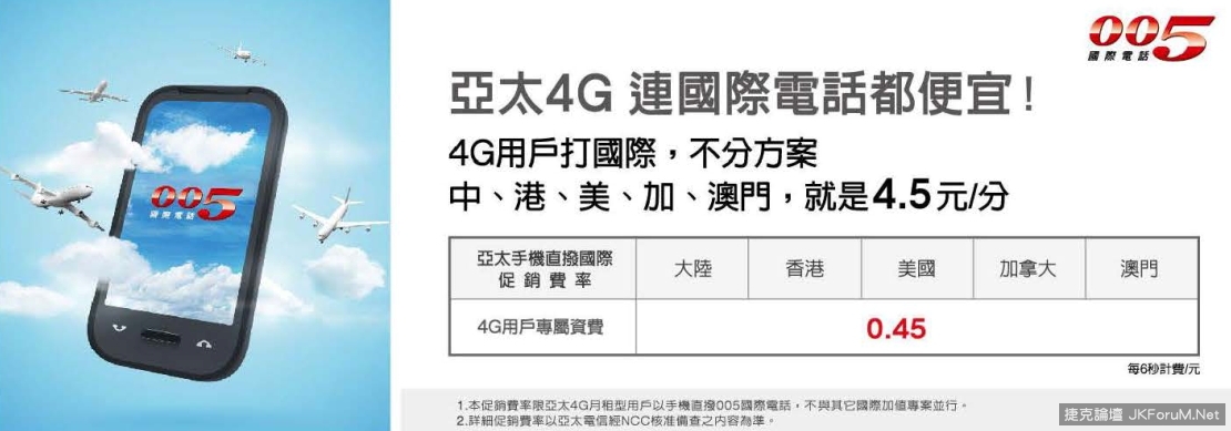 1.本促消費率限亞太4G月租型用戶以手機值撥005國際電話,不與其它國際加值專案並行