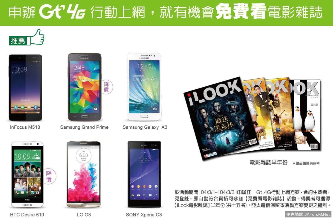 於活動期間104/3/1-104/3/31申辦任一Gt 4G行動上網方案,合約生效者,免登錄,即自動符合資格可參加「免費看電影雜誌」活動。得獎者可獲得「iLook電影雜誌」半年份(共十五名)。亞太電信保留本活動方案變更之權利。