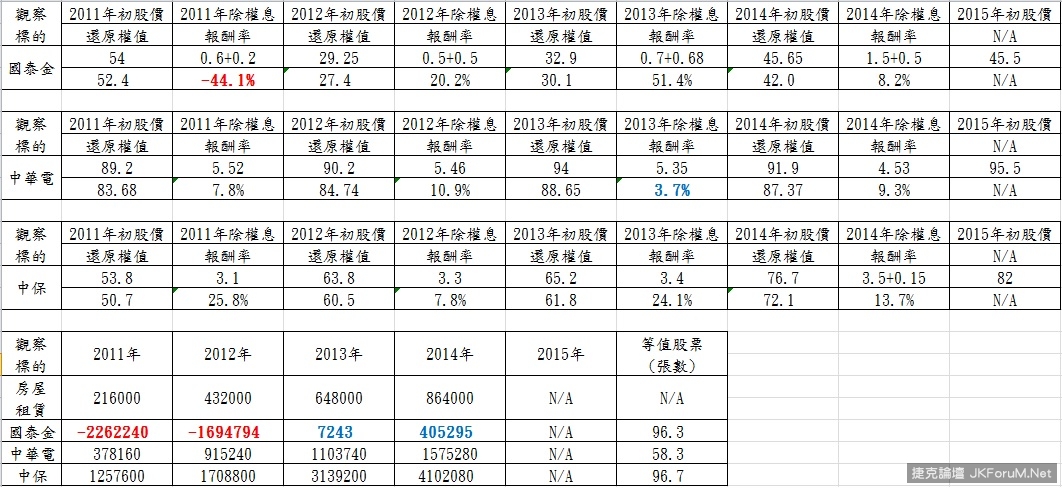 二、若投資的目的是期望獲得穩定的現金流,建議將資金購買有價證劵,賺取較高的報酬。以本案列舉三檔個股為例,只要做好功課(其實沒想像中的難,多看幾本書或我的文章即可),相信在2011年你(妳)能避開國泰金、2013年你(妳)也能避開中華電,甚至全程選擇中保。結果如圖下方對照表所示,以同樣的資金,可獲得更高檔次的富足與安心感受。