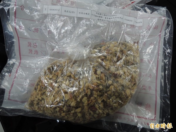 台北市衛生局今早公布4月份第一波針對市售茶飲店、茶行等「茶葉及花草茶農藥殘留抽驗計畫」結果,其中喜�咖啡屋(咖啡弄)「茉莉花(茶)」檢出殺蟲劑三落松(Triazophos)0.13ppm,超過標準的0.10ppm,來源廠商為高雄市河億貿易有限公司。
