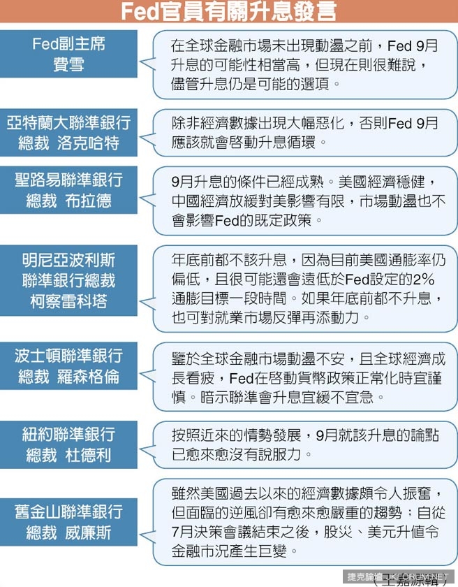 美國近來多項數據顯示,經濟復甦動能強勁,外界原預期,聯準會將在9月升息。詎料,人民幣8月無預警大貶,掀起全球股災,中國大陸經濟成長可能放緩的疑慮,已成為聯準會利率決策的重大變數。