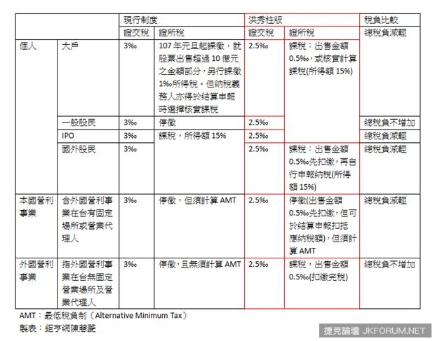 另外,值得注意,本次「洪版」雖將外國營利事業(其於我國境內無固定營業場所及營業代理人)納入證所稅課徵範圍,但實質上,對此種外資法人的股票交易總稅負並無影響,原因在於現制下此種法人出售股票僅須課徵3‰的證交稅,於「洪版」下其總稅負為證交稅2.5‰加上0.5‰證所稅,總稅負與現制同為股票售價的3‰。
