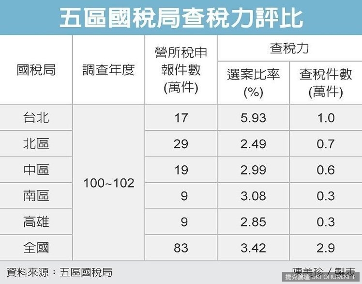 誰是查稅力道最猛的國稅局?答案是台北國稅局。根據統計,全台各國稅局平均查稅率是3.42%,台北國稅局接近6%,設籍台北市的企業,平均每百家會有六家被查稅。