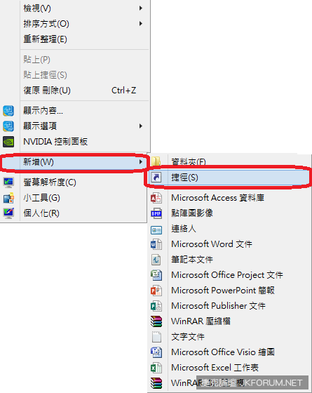 1.在桌面上按下滑鼠右鍵點新增--->捷徑(如下圖)。