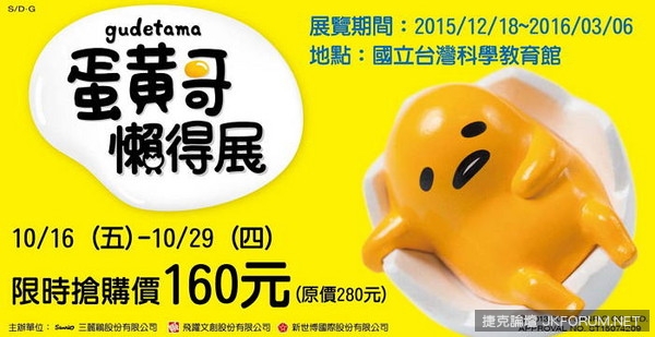 三麗鷗旗下的人氣角色「蛋黃哥」,宣布將於2015年12月,於國立台灣科學教育館舉行「蛋黃哥懶得展」的消息。