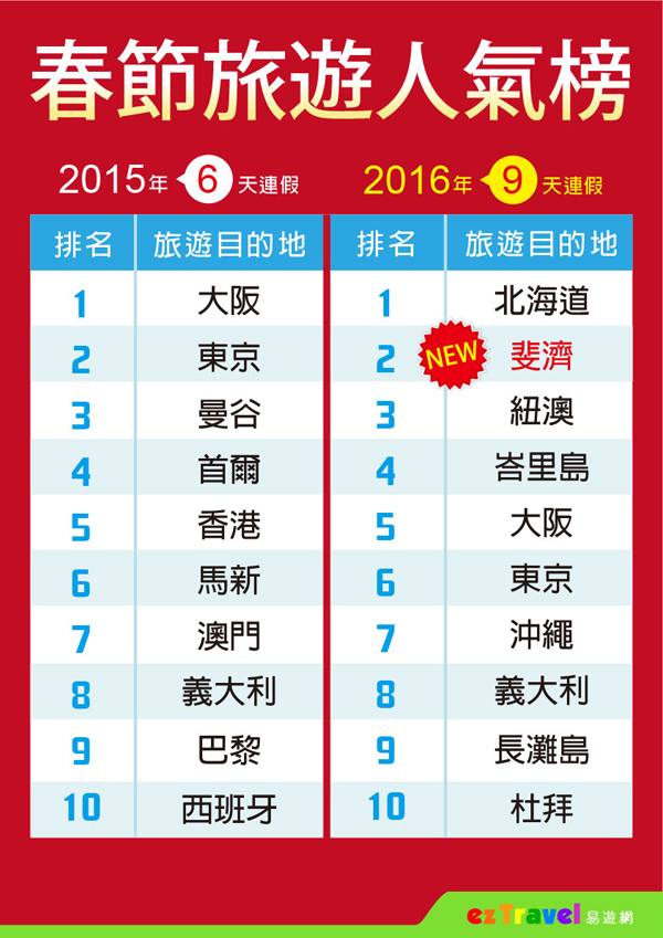 讓我們來瞧瞧,2016春節旅遊人氣榜前十名榜單