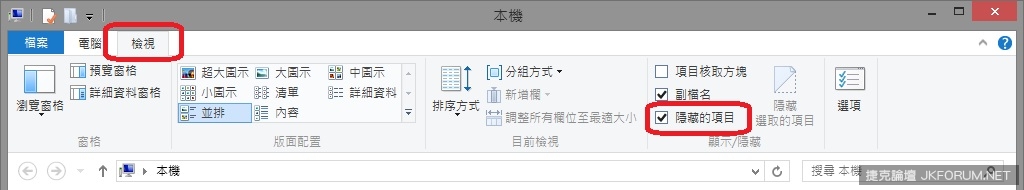 1.在Win8桌面上的本機中上方功能區的檢視中有一個隱藏的項目給他打勾起來,如圖片所示