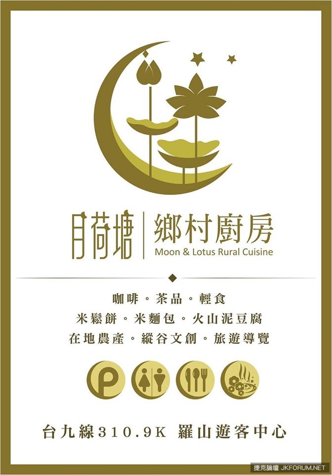 月荷塘鄉村廚房,想給台9線路過旅客,來點不一樣的味蕾刺激,用在地的食材、傳統的人情、現代的料理、悠閒的心情,在羅山旅客服務中心與您相遇,提供咖啡、茶品、豆漿、米鬆餅、米麵包、特色麵包、泥火山豆腐、主廚飯糰。