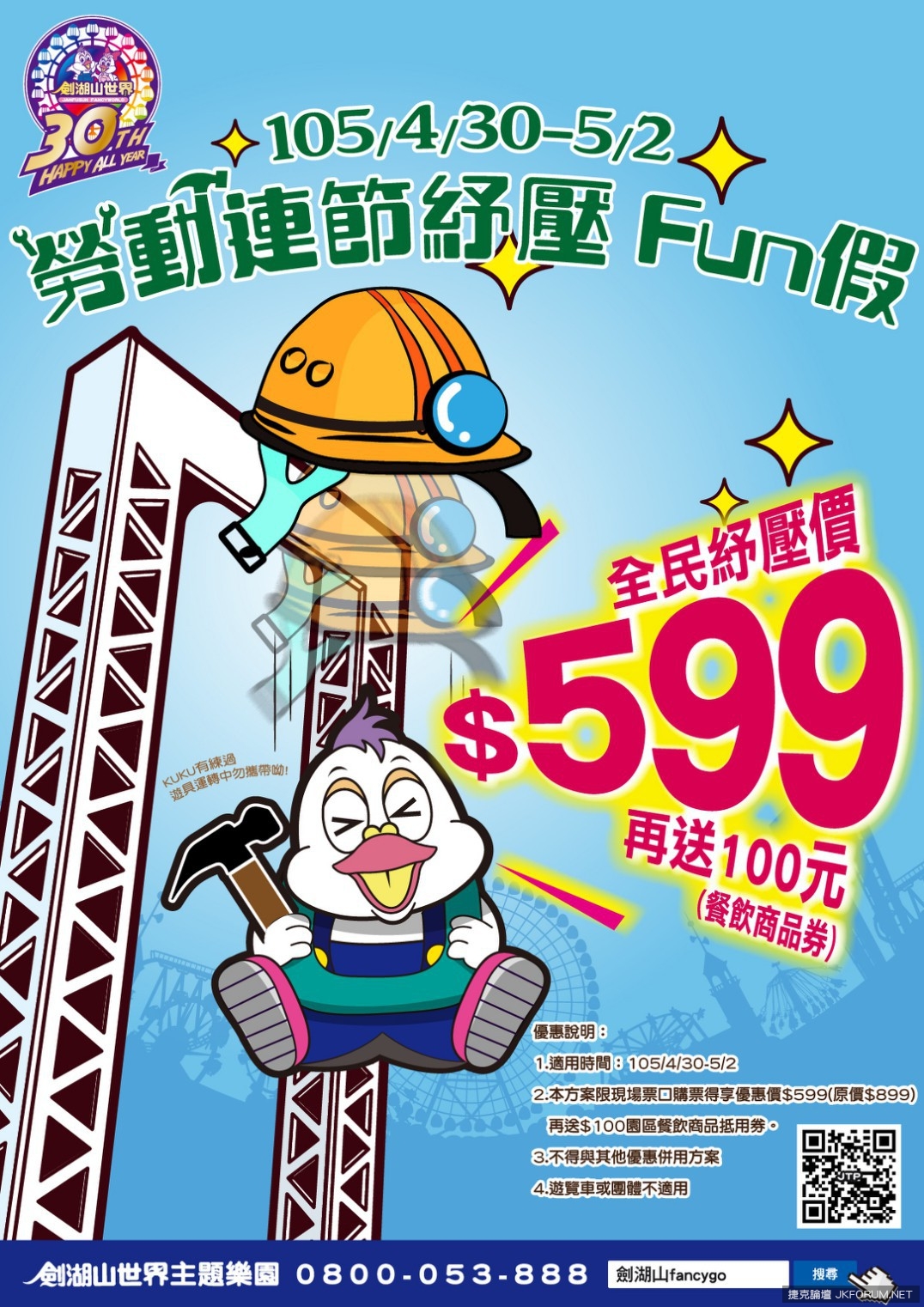 105/4/30~5/2,全民紓壓價每人只要599元,再送你100元餐飲商品抵用券哦!