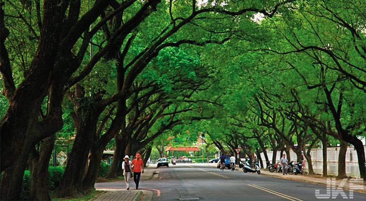 省府路上筆直大王椰子,宛如兩排迎賓的衛兵,椰影下人行道兩旁是一大片荷塘,每年六月嫣然綻放;彎過中興新村大門牌樓,樟樹搭起天然的綠色隧道,從光華路一路綿延到光榮北路;繞著兒童公園走一圈,熱情洋溢、花開滿枝的則是鳳凰木;大操場邊,盤根錯節的老榕樹聯手撐起一整排壯觀的綠色大傘;彎到中正路,夾道的菩提樹迎風拍得陣陣作響;再繞到新興路,阿勃勒的金黃色花串隨風如雨飄落,灑下一地「黃金雨」。如果腳程還夠,省政資料館後的小葉欖仁,中學路上的桃花心木,光榮東路的白千層,光榮南路的印度紫檀,光明路的楓香,還有環山路旁高齡三五○歲的茄苳老樹,也各有姿態與風情。
