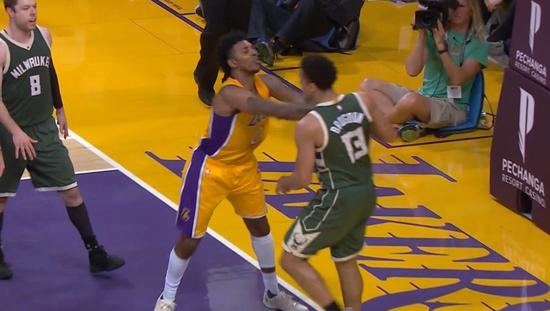 湖人射手尼克楊(Nick Young)今天在比賽的第三節中,因為不滿公鹿菜鳥布洛登(Malcolm Brogdon)犯規動作過大,一怒之下大力了推了對方一把,引起雙方一波「激情四射」的衝突,但這回尼克楊不再是孤軍奮戰,身旁的小老弟看到「小老大」被欺負,當然通通一湧而上,展現了令人動容的兄弟之情。