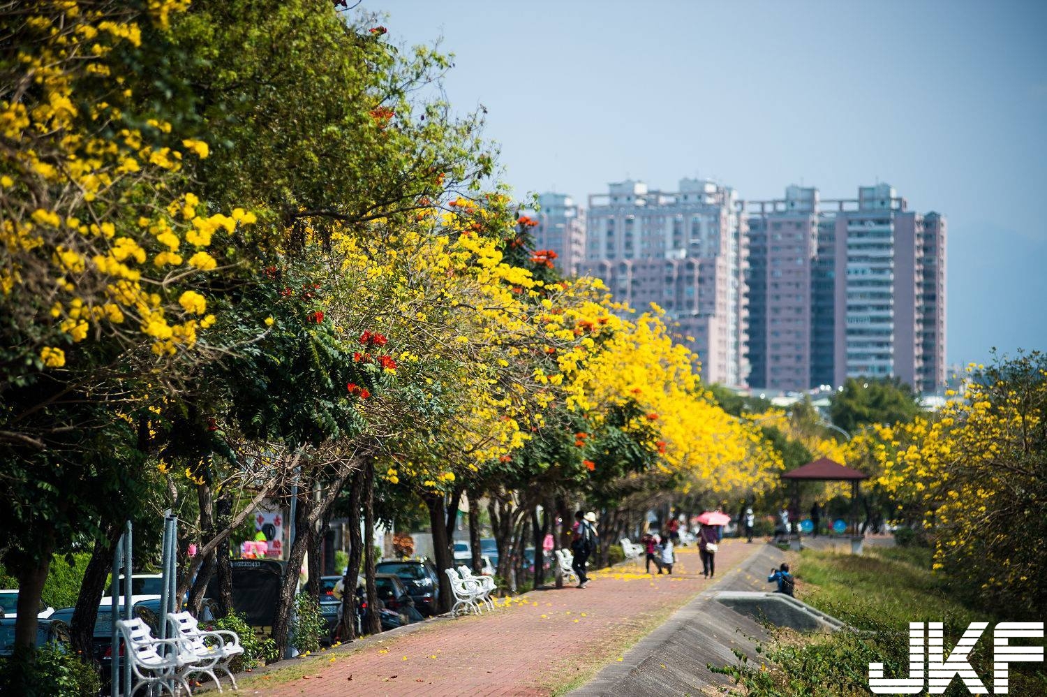 首波主打的黃金風鈴木因適逢暖冬,花期提前。還好目前仍有不少金黃花瓣綻放枝頭。塗市長打趣說,身旁的女朋友漂亮,「花好月圓」,就很羅曼蒂克,歡迎民眾把握最後機會,漫步堤岸、浪漫賞花。