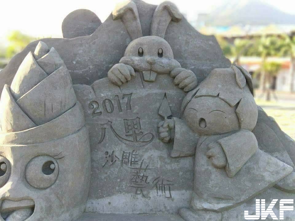本次將展出5座沙雕藝術作品,以八里著名的特色產業竹筍與柚子為創作的入口意象-「竹佑平安double兔」、大型主雕「廣寒宮」和「嫦娥逗陣訪月宮」、「幸福體驗的八里 婚〝沙〞」、「期待邱比特的愛」等藝術創作。歡迎民眾前來遊賞體驗沙雕藝術創作的樂趣與生活美學。