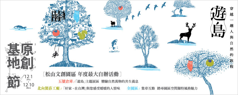 循著大地脈動作息的人們,與腳下方寸之地共享與萬物共生的密碼。2017年原創基地節以「遊島」之名,12月1日(五)至12月10日(日)於松山文創園區邀請您穿越一趟自然與人的旅程,分享來自各個領域的創作者,對於萬物滋養的體悟與學習,感受與萬物的共生養息,循環依存的世代智慧。