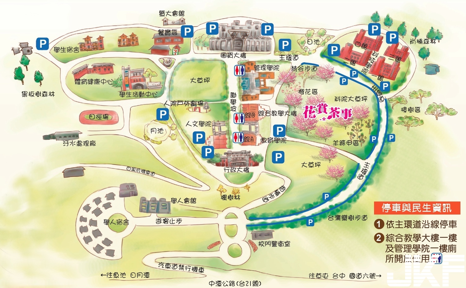 繳納50元停車費用進入校園,可自備品茗茶具在櫻花林下賞櫻品茗。
