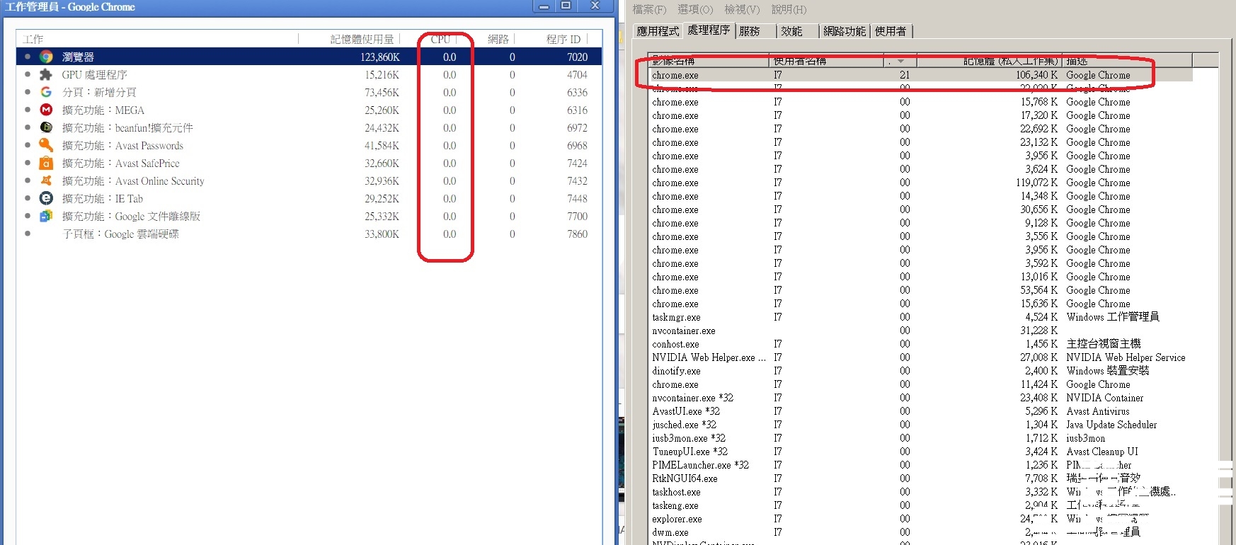 然後我再2X%CPU使用率那個CHROME的程序點右鍵 結束處理程序 也沒有跳出哪裡錯誤.
