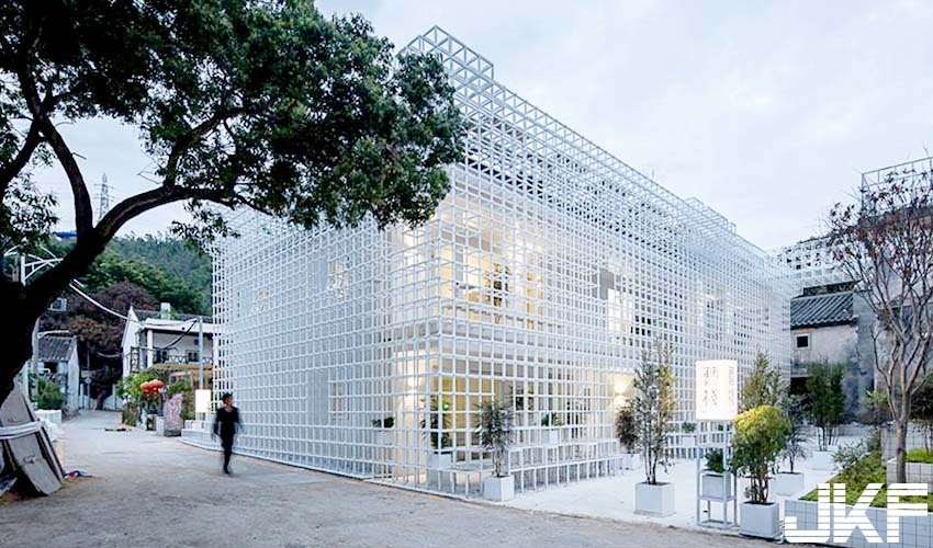 漫步於深圳官湖村中,能發現一間間逐漸褪去光彩的老宅中,佇立著顯眼吸睛的純白鏤空建築,那是由 空氣聯盟建築設計事務所 設計師 黃澤林與民宿主人 邱思誠共同打造的藝文旅宿「藝棧 ARTINN」,改造具 70 年歷史的連排老屋,針對開裂牆體與變形問題施以加固結構,使用白色鋼材交疊成空間桁架包裹原有建築,平衡內外風景、也形塑新穎樣貌,讓行走在此的旅人感受四周風景。