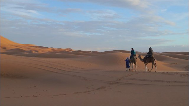 從馬拉喀什到沙漠入口梅如卡,足足要搭12小時的巴士,這是摩洛哥東南部的邊境小鎮,接近阿爾及利亞邊境。沙漠的天氣變得很快,日夜溫差大。第一次來