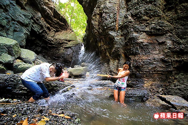 「沒煮過叫水,煮過叫茶,欖仁溪水質好,當地人喫水不喫茶」,沒多久抵達溪畔,腳上雨鞋發揮作用,徐明正引我們由淺水處溯溪上行,最後一小段手腳並用,來到瀑布下的清潭,這時竹製水槍終於派上用場,戲水濕身、無比沁涼。玩餓了?別忘了回程時到小花雨來菇農場,品嘗外頭吃不到、地產地銷的雨來菇料理。