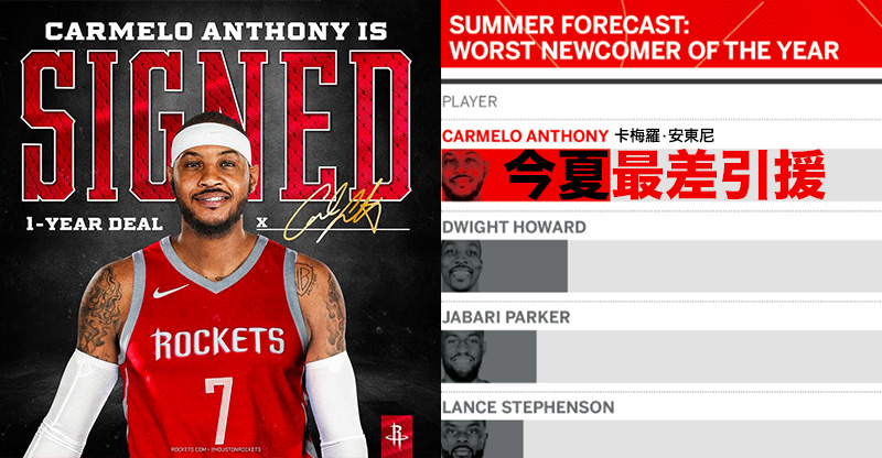 But,安東尼加盟火箭真的事件喜事嗎?ESPN卻不這麼認為,在今夏引援評選中,ESPN認為湖人「詹皇」姆斯(LeBron James)是今夏最佳引援,而同為姆斯03梯好兄弟的甜瓜,卻被ESPN評為今夏最差引援。完整比較如下: