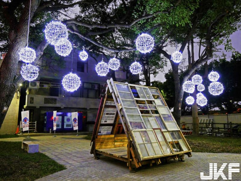 由眷村屋頂層層堆疊打造的裝置藝術,夜晚點燈後更顯浪漫。